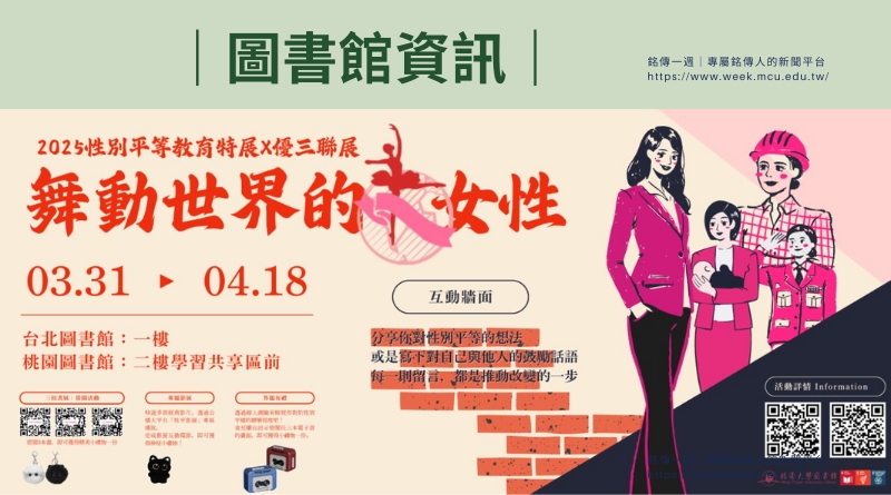 為推廣性別平等教育,銘傳大學圖書館與優三聯展合作,於3/31(一)至4/18(五)舉辦「2025性別平等教育特展X優三聯展—舞動世界的女性」,精選涵蓋文學、家庭、職場等多元面向的女性議題書籍,帶領大家一同探索女性在社會中的挑戰與突破。本次展覽於台北校區一樓與桃園校區二樓學習共享區前展出,並設置「她的聲音」互動牆,邀請大家留言分享對性別平等的想法,讓每一則留言成為推動改變的一步。