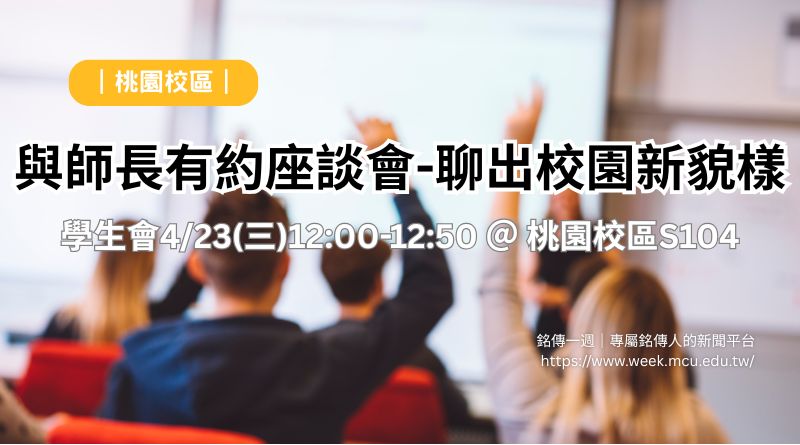 桃園校區學生會將於4/23(三)中午於資訊大樓S104國際會議廳舉辦「與師長有約座談會」,邀請桃園校區同學們踴躍參加,座談會將針對課程安排、校園設施、學習資源與學生權益等議題,進行公開、面對面的溝通交流。此次座談會期望打造一座師生之間的對話橋樑,讓同學有機會提出建議,學校也能聽見第一線的真實聲音。