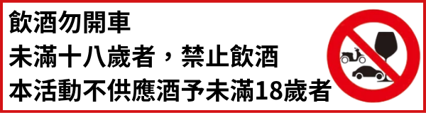 - 未滿十八歲者禁止飲酒,故本活動不提供酒予未滿十八歲者,提醒您「飲酒勿開車」。