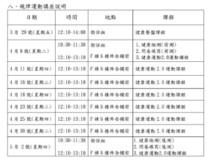 The first session, “Nutrition Course,” will be held on March 29th (Friday) from 12:00 to 13:30 in Room B901. Participants will learn about healthy eating habits and how to make healthy food choices for dining out. In addition to dietary control, regular exercise is an indispensable part of maintaining a healthy weight. Therefore, the dynamic “Healthy Posture 2.0” program will take place from April 9th (Tuesday) to May 2nd (Thursday), with aerobic fitness exercises held every Tuesday and Thursday at noon in front of the bulletin board on the 6th floor of Building F. If you want to make changes to become healthier but don’t know where to start, be sure to sign up for this course! Spaces are limited, so let’s develop good exercise habits together!