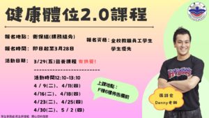College life is a vibrant and challenging stage in one’s life. While pursuing academic achievements, engaging in social activities, and personal growth, maintaining physical and mental health is essential. The Campus Health Services Section of the Student Affairs Division will be organizing the “Healthy Posture 2.0 Program” at the Taipei Campus, inviting everyone to prioritize the issue of health sustainability. All faculty, staff, and students with a BMI>25 are eligible to participate. Those who attend all sessions and complete 6 regular exercise classes will receive exquisite gifts. Registration is open from now until March 28th (Thursday). Please visit Nurse Practitioner Min-Hsuan at the Campus Health Services Section on the first floor of the Administration Building (extension: 2224) to register. During the event, aerobic fitness expert Danny will lead everyone towards a healthy and delicious lifestyle.