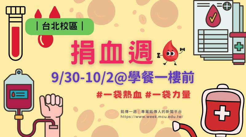 為響應公益並緩解醫療用血庫存壓力,台北校區衛保組將於9/30-10/2,每天10:00-17:00在學餐一樓前停車場舉辦本學期的「一袋熱血,一袋力量」愛心捐血活動,邀請全校師生發揮熱血,將愛傳遞下去。