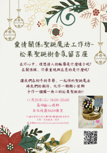 這一系列活動希望幫助同學們在愛情關係中找到舒適的平衡,透過手作活動感受更多愛的多樣性與獨特性,活動進行時有專業心理師提供指導,同學們不僅能在工作坊中親手製作專屬的聖誕裝飾與創意玻璃杯,更能藉由活動沉澱心靈,思考愛情的意涵,內容輕鬆愉快,並結合節慶氛圍,讓同學們預約聖誕的魔法,共度充滿溫馨的冬日時光。