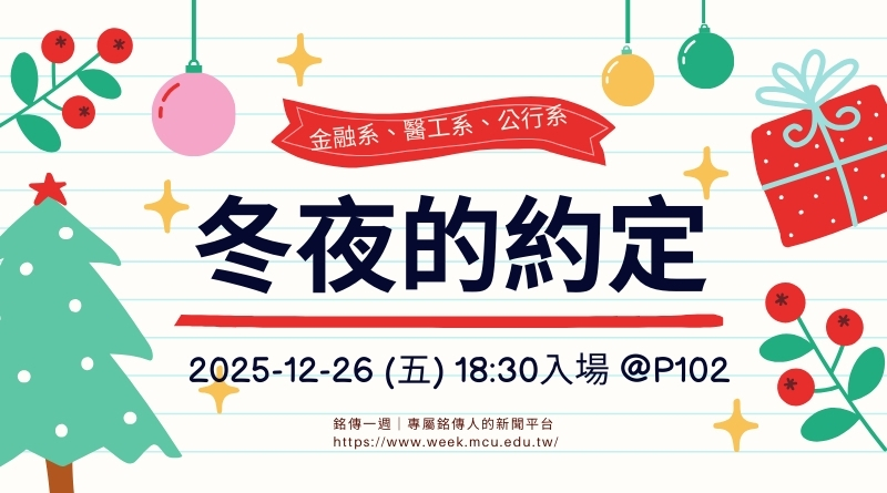 聖誕節腳步靠近,校園裡的節慶氣氛也悄悄升溫。金融系、公行系與醫工系三系學會將於12/26(五)19:00在P102舉辦聯合聖誕晚會「冬夜的約定」,18:30開放入場,邀請全校同學在期末之際放緩步調,提前感受聖誕與跨年的溫馨歡樂。
