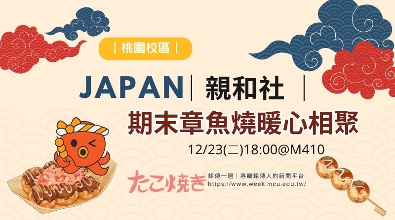 冬季氣溫逐漸下降,卻澆不熄同學們對美食與表演的熱情。桃園校區親和社將於12/23(二)18:00–20:00在M410舉辦本學期最後一堂社課,以熱騰騰的章魚燒作為期末前的小小慰勞,邀請同學在忙碌的期末週前夕,一起度過輕鬆愉快的夜晚。