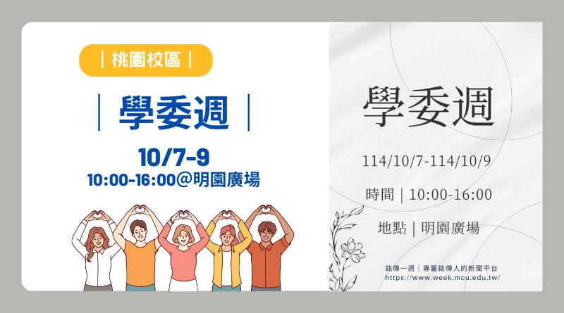 桃園校區學委會將於10/7-9在明園舉辦114年「學委週」,...