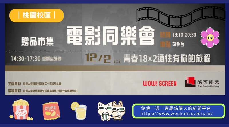 十二月的桃園校園被冬意輕輕包裹,節慶氛圍悄然蔓延,電影的光影也在此刻點亮。學生會將於12/2(二)14:30-...
