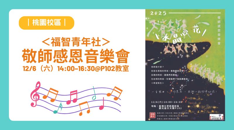 由桃園校區福智青年社主辦的「水晶心花・敬師感恩音樂會」將於12/6(六)在P102溫暖登場,邀請師生在樂聲中暫...