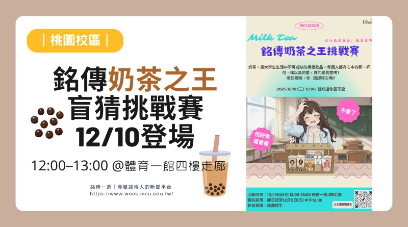 奶茶向來是大學生生活中的療癒象徵,而每個人心中也都有一杯「最強奶茶」。為找出屬於銘傳人的代表風味,課指組將於1...