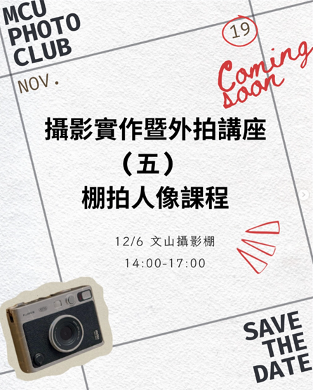 攝影美學社將於12/6(六)14:00–17:00前往文山攝影棚(羅斯福路六段87號2樓後門)舉辦「攝影棚外拍...