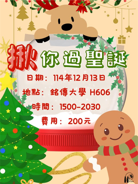 僑見銘傳將於12/13(六)15:00–20:30在H606舉辦114學年度聖誕活動「揪你過聖誕」,以交換禮物...
