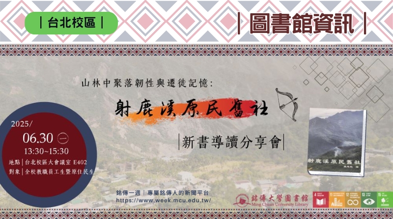 為推廣原住民文化及建築聚落研究,台北校區圖書館將於6/30(一)13:30至15:30,在E402大會議室舉辦...